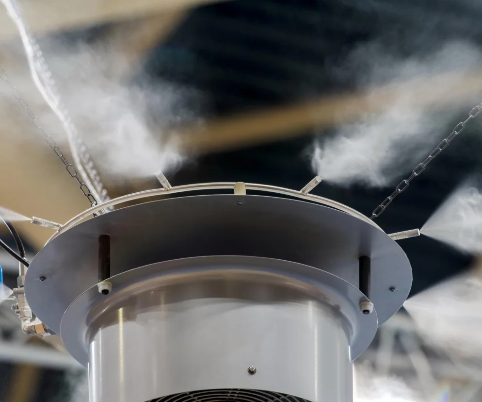 Dodatkową korzyścią, cenioną zwłaszcza w miesiącach letnich, jest chłodzenie adiabatyczne. Systemy nawilżania wodnego wykorzystują zjawisko parowania – woda przechodząc w stan gazowy pochłania ciepło z otoczenia, obniżając temperaturę powietrza. W praktyce oznacza to, że hala produkcyjna może być naturalnie chłodzona bez kosztownych systemów klimatyzacji lub przy znacznie mniejszym ich obciążeniu.
